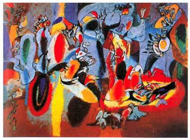 Arshile Gorky Armenian jaio zen 1904.. rtean. Hamasei urte zituela Estatu Batuetara erbesteratu zen, eta 1925. urte inguruan New Yorken hartu zuen bizilekua. New Yorkeko Arte Eskolan ikasle izan zen lehenbizi eta irakasle gero. Lagun izan zituen Stuart Davis eta Willem de Kooning. Gorkyren lanak, bestalde, Picassoren eragin nabarmena izan zuen, 1927-1928 urteetakoak batez ere. Dena dela, eredu izan zuen artista horrek baino estilo lasai eta dinamikoago bat landu zuen : Artista eta bere arra (1926-1936, Whitney museoa, New York). 30eko hamarraldiko azken tuteetan gero eta gehiago jo zuen forrna organikoetara eta anatomikoetara : Lorategia Socbin (1941, M.O.M.A., New York). 1942an kamuflajeko ikastaroak eman zituen Gorkyk eta horrek irudi errealen eta surrealen arteko harremana zehazten lagundu zioten. Handik bi urtera, Andre Breton eta surrealistak ezagutu zituen, eta horrek garrantzi handia izan zuten Gorkyren lanean. Surrealismoaren azken kidetzat eta espresionismoabstraktuaren lehenengotzat hartzen da : Orlan •a ren gibela eta gandorra (1944, AIbright-Knox Arte galeria, Buffalo) ; Lorez apaindutako errotako ura (1944, M.O.M.A., New York). Aipagarriak dira 1930eko ekonomia krisi handiaren garaian egin zituen zenbait lan (Newark eta Nueva Jerseyko aireporturako freskoale ; hornia irudia New Yorkeko Munduko eraskusketarako, 1939).