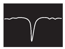 • b) Irudia. Amoniakoaren absortzio kurba osziloskopio batean hartua. Gas horretan zehar igorritako irrati uhinen izpi batek emandako potentzia erakusten du kurbak. Maiztasuna ardatz horizontalaren arabera aldatzen da. Erresonantzia maiztasunean uhinaren parterik handiena xurgatu egiten dela erakusten du, kurban, haranak. Muturreko maiztasunek mugatzen dute, erresonantzia eremuan, amoniakozko erlojuen zehaztasuna; muturreko maiztasunak haranaren zabaltasunaren araberakoak dira.