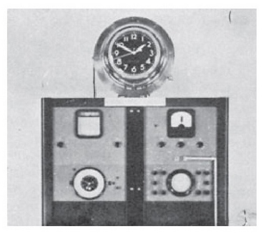 • a) Irudia. 1949an, Washingtongo National Bureau of Standars-en bukatu zen lehenengo amoniako atomozko erlojua. Amoniako gasa daukan uhin gida ikusten da erloju elektrikoaren esferaren inguruan; erlojuaren azpian, berriz, kristalezko oszilatzailea eta beste zirkuitu elektronikoak
