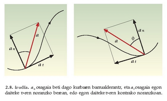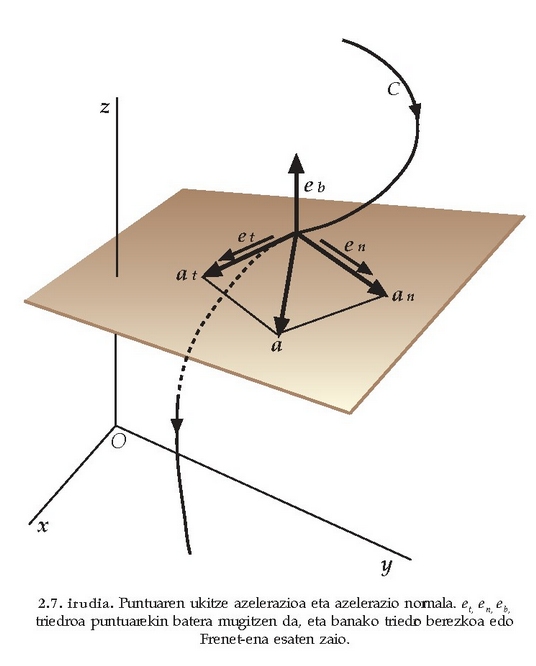 b) Kasu batzuetan, puntu jakin baten mugimendua honela definitzen da: C ibilbidearen gainean P0 puntu finko bat eta noranzko positibo bat hartzen dira modu arbitrarioan (2.2. irudia). s arkuaren luzerak definitzen du, luzera hori algebrako magnitudetzat harturik, P puntu mugikorrak edozein unetan duen posizioa. Beraz, t denboraren balio bakoitzari s arkuaren luzeraren balio bat egokituko zaio, hau da: