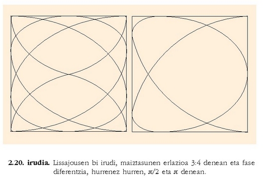 2.20 irudian Lissajousen bi irudi marraztu dira, maiztasunen erlazioa 3:4 denean eta fase diferentzia,