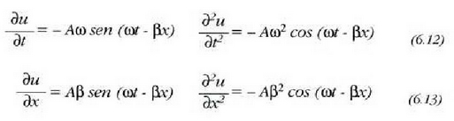 u(x, t) = A cos (la - bx) uhin laua deribatu partzialetan emandako ekuazio baten kasu partikularra da, lortzen erraza. Izan ere, u(x, t)funtzioa bi aldiz deribatzen bada t denborari buruz eta beste bi aldiz x kokaguneari buruz, emaitza hau ateratzen da: