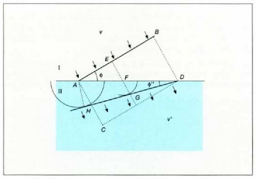 den argiaren parte bat lehenengo ingurunean islatzen da, eta beste parte bat bigarren ingurunean sartzen da. Eman dezagun bigarren ingurunean sartzen den argia bakarrik hartzen dela kontuan, eta v lastertasunean doala argi hori. B puntuak lehen ingurunean DB distantzia betetzeko behar duen denboran A puntuak ez clu AC distantzia betetzen bigarren ingurunean, baizik eta AH distantzia bat.
