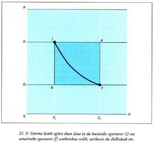 23.1: Tenperaturak aldagabe irauten duenean gas idealaren mol batek Vi bolumena hartzetik Vf bolumena hartzeraino zabaltzean egin duen lana adierazten du alde ilunak irudi honetan.