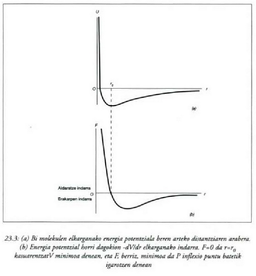 Eman dezagun molekulak biribilak direla, gutxi gorabehera. Grafiko baten bidez azaldu ahal izango dira orduan molekularteko indarrak.bi molekulek duten elkarganako energia potentzialaren (U) grafikoa eginez, haien erdiguneen artean dagoen distantziaren (r) arabera. Molekula bakoitzari eragiten dion indarra (F) energia potentzialarekin (U) lotua dago, adierazpen honen bidez: . 23- 3a irudiak U(r) tipiko baten grafikoa agertzen du. Irudika dezagun molekula bat O puntuan finko. Beste molekula O puntutik aldaratuko da U malda negatiboa denean, eta malda positiboa denean, herriz, O punturantz erakarria izango da. puntuan ez da indarrik molekulen artean, malda zero da. Energia potentzialaren funtzio horri dagokion elkarganako indarra F(r) irudikatu da 23-3b irudian. Bi molekula berdinek elkarganako energia potentziala zero duten punturaino dagoen tartea talka batean egon daiteken hurbiltze handieneko distantziatzat -hau da, molekularen gutxi gorabeherako diametrotzat- hartzen da askotan. Molekula sinpleen diametroa m da, gutxi gorabehera. Molekulen arteko indarrak huts bihurtzen dira m-ko distantziara, hau da 4 diametroko distantziara. Beraz, molekula indarrek oso irismen laburra dute. Potentzial minimoa duen distantzia (oreka puntua) da molekula sinpleentzat. Molekulek tamaina eta barne egitura desberdinak dituzte beren kargetan, eta molekularteko indarrak desberdinak dira molekula batetik bestera. Hala ere, irudietan adierazi den portaera kualitatibo hori dute beti.