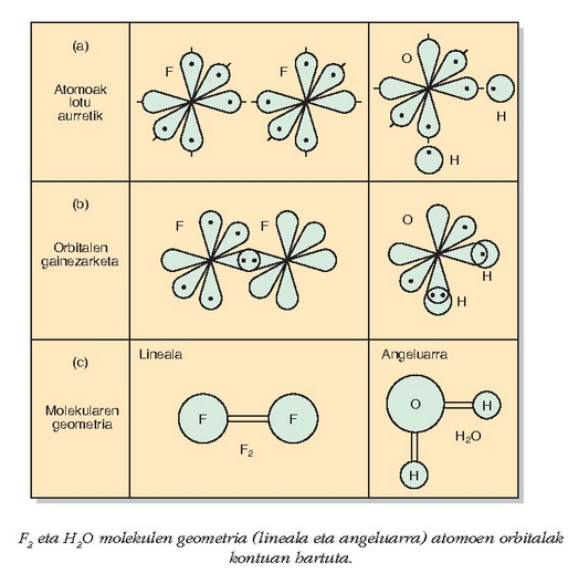 F2 eta H2O molekulen geometria (lineala eta angeluarra) atomoen orbitalak kontuan hartuta.