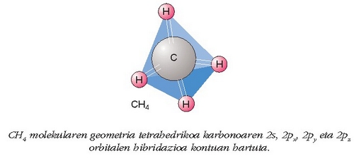 bidez ikusitako metanoaren geometria. Ikus irudia: molekularen eraketa orbital hibridoen bitartez.
