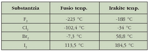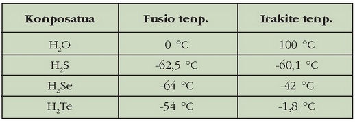 bada bat gainerakoen tasunetik erabat aldentzen dena: ura, alegia. Aldera ditzagun taula batean substantzia horien fusio eta irakite tenperaturak: