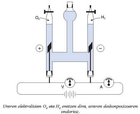 Uraren deskonposatze elektrolitikoa nola egin daitekeen adierazten du irudiak. Energia elektrikoa xahutu ahala, oxigenoa eta hidrogenoa askatzen dira.