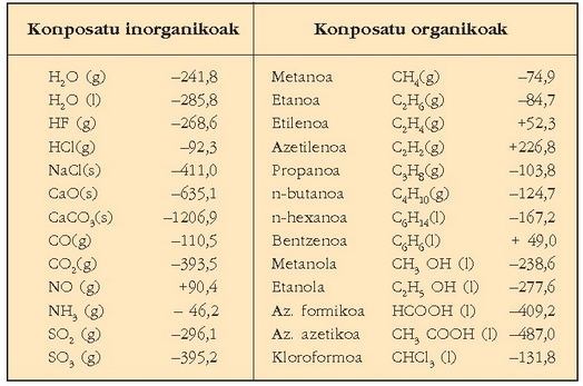 Taula honetan zenbait gaik 25°C-tan dituzten eraketa entalpiak ematen dira.