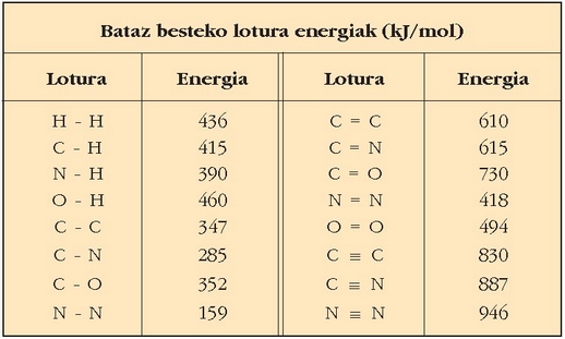 Ondoko taulan lotura energia arruntenak ikus daitezke. Bataz besteko energiak dira taulan ematen direnak, ezin baita esan lotura jakin batek beti duela egonkortasun bera, lotura bera izan arren, lotura hori zein molekulatan dagoen, ezberdina delako, oso ezberdina ez bada ere. Honela, C-C lotura ez da berdin-berdina etanoaren kasuan eta azido azetikoaren kasuan (H3C-COOH)