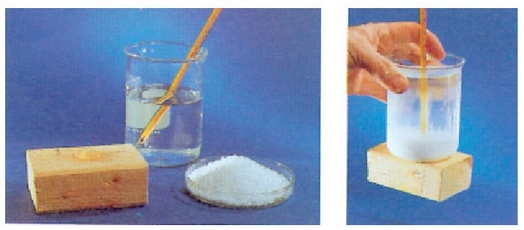 Amonio nitratoaren disolbatze prozesua endotermikoa dela frogatu nahi da irudi hauekin. Ontzian ura dago giro tenperaturan, kristalizadorean amonio nitratoa, eta ezkerraldean egur zatia, gainaldean ur tanta handi bat duela. Amonio nitratoa uretara bota eta gero, ontzia egurraren gainean jarriko da.