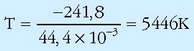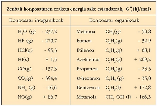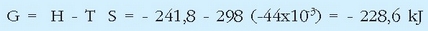 Eta bertan gertatzen diren entalpia eta entropia aldaketak, berriz, hauek dira: H = - 241,8 kJ eta S = - 44,4 J/K (denak 298 K- tan eta 1 atm-ko presioan). Erreakzioaren energia askearen aldaketa erraz kalkula daiteke adierazpen honen bidez: