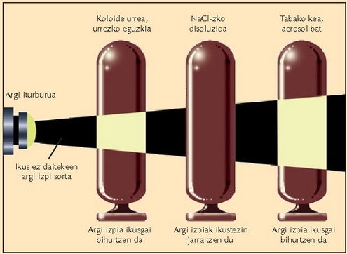 da koloideetan, eta Tyndall efektu esaten zaio. Argi ikuskorra barreiatu ahal izateko partikulak
