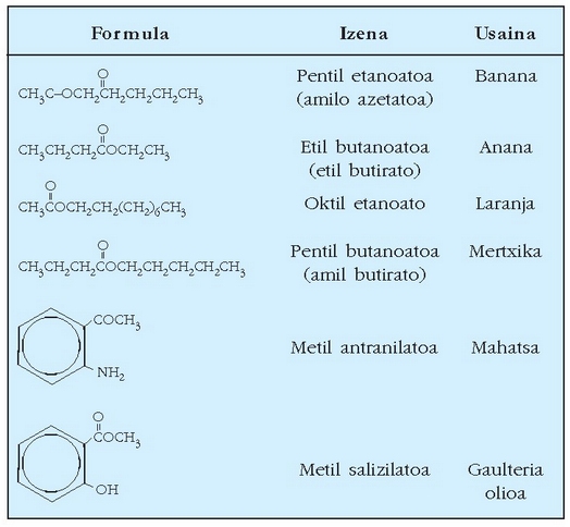 Asko erabiltzen den beste familia organiko bat esterrak dira: pamil azetatoa (banana usainduna), etil azetatoa (sagar usainduna), etab. Azido salizilikoa metanolarekin erreakzionaraztean metil salizilatoa sortzen da (gaulteria olioa), oso erabilia urrinen munduan.