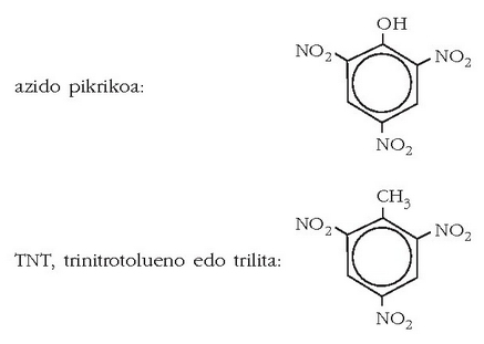 zati landare ikatz (C) + 10 zati sufre (S). Beste lehergai ospetsu bat TNT da, trinitrotolueno edo trilita