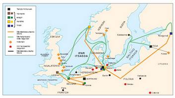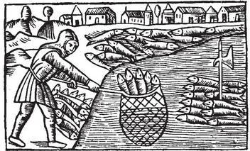 Danimarkako arrantzale baten grabatua (XV. m.). Garai hartan Eskandinaviak esportatzen zuen produktu nagusia arrain gazitua zen, zeina Atlantiko aldeko portu guztietara zabaltzen baitzuten Hansako itsasontziek.<br><br>