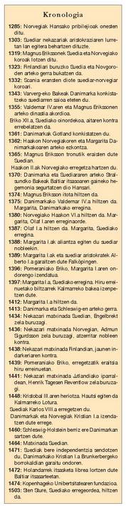XIV. mendean, nobleen aldeko erreinaldi sail bat izan zen Danimarkan; erreinaldi sail hori ?barne anarkiazko? aldi batean bukatu zen (Musset). Garai berean, Norvegia Hansaren eskuetan zegoen: 1258an berretsi ziren Hansaren pribilejio guztiak, norvegiarren kalterako izan zen gerra batenondoren. 1319an norvegiar errege bat, Magnus Eriksson (1319-1363), koroatu zuen suediar aristokraziak errege, eta, hala, lehen eskandinaviar batasuna sortu zen. Suedian ordurako finkatuak zeuden ohitura feudalak, zergak ezabatu eta lurrak zaldizko borrokalariei eskainita, eta laster burutu zen Finlandiaren konkista eta kristautzea, Novgoroden kontra.Magnus Erikssonek, Danimarkako kaos egoeraz baliatuz, izan zuen garaipenik hegoaldean ere, eta Scania eta Halland beretu zituen. Baina beste daniar errege batek berreskuratuko zituen biak, Valdemar IV.ak (1340-1375), Varbergeko Bakearekin egoera aldarazi ondoren (1343). Bi haien seme-alaben ezkontzak (Haakon eta Danimarkako Margarita), hiru erreinuen oinordeko bihurtu zituen errege-erreginak. Baina beste gerra batek eta Hansak Suediako sezesioaren alde esku hartzeak, Meckleburgeko Alberto I.a egin baitzuen han errege, batasun asmoak zapuztu zituen, itxuraz. Hala ere, daniar eta norvegiar koroak elkartzea lortu zuen Margaritak senarra, Haakon VI.a, eta semea, Olaf I.a, hil zirenean. 1814 arte iraun zuen lotura horrek.