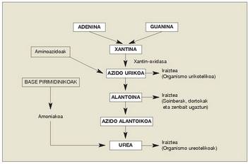 LABURPENA: Izaki biziak gluzidoez eta lipidoez baliatzen dira energia lortzeko. Organismoarentzat garrantzi handikoak diren beste osagai batzuek, hala nola proteinek eta azido nukleikoek, beste zeregin batzuk dituzte, baina, hala eta guztiz, energia iturri gisa ere erabil daitezke zenbaitetan. Bai proteinak bai azido nukleikoak gai nitrogenodunak dira; nitrogenoa kanporatzean oso gai toxikoak sortzen dira. Hori dela eta, halako prozesu edo bide berezi batzuk sortu dira hondakin nitrogenodun horiek arriskugabeko gai bihurtzeko edota, organismoak kanpora ditzan arte, nolabait neutralizatze aldera.