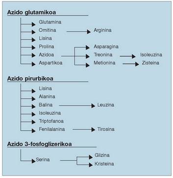 azido 3-fosfoglizerikoa.Hiru aminoazido, lisina, isoleuzina eta
