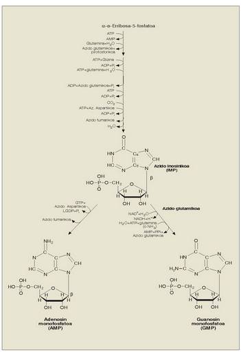 bi. Bi kasu horietan nukleotido osoak sintetizatzen dira, eta ez banakako base nitrogenatuak.- Base purikoen anabolismoa (5. irudia).