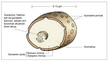 LABURPENA: Gunea zelularen organulu guztiz berezia da, gunearen mende baitago ia osorik zelularen jardunbidea. Normalean, gune bana izaten da zeluletan, eta bi itxuratakoa izan daiteke, zelularen bizitzaren unearen arabera; hori dela-eta, bi gune mota bereizten dira: interfaseko gunea eta meiosikoa. Hauek dira gunearen osagaiak: mintza poroduna (bikoitza da), nukleoloa, nukleosoma eta kromatina. Azkenak, kromatinak, DNA dauka bere baitan, informazio genetikoa duena, eta gunearen jardunari eragiten dioten egitura desberdinak (sakabanatua edo trinkotua) izan ditzakeena. Bi dira gunearen eginkizun nagusiak (kromatinarenak batez ere): batetik, proteinen sintesiaren bitartez zelularen bizitza gidatzea, eta, bestetik, material genetikoaren bikoiztea. Gainerako organuluek kromatinarekin zerikusia duten eginkizunak betetzen dituzte (erribosomen sintesia, etab.).