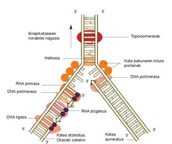 LABURPENA: Zelula amatik zelula alabara informazio genetikoa trasmititzeko DNA errepikatu behar da, izan ere, DNA baita informazio genetiko horren eramaile. DNA errepikatzen denean, DNAren helize bikoitzeko bi kateak banatzen dira, eta bi kate berri sintetizatzen dira; bi kate berri horien baseen sekuentzia aurreko baseen osagarria da. Sintesian zelulako nukleotidoak erabiltzen dira. Errepikatzearen prozesuan kateetako bat mantentzen da.