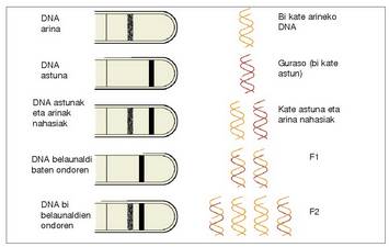 Nitrogeno astuna zuten zelulak 14N zuen inguru batean jarri zituzten; DNA behin bakarrik errepikatzeko denboran eduki zituzten inguru hartan. Zelula horien DNA lagin bat zesio kloruroaren gradientean zentrifugatu zuten; eta ikusi zuten DNA horrek zerrenda bakar bat zuela DNA astunaren eta DNA arinaren artean.
