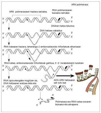 Hortik aurrera, entzima horrek DNAren helize bikoitza zabaltzen du, eta helize bikoitz horren kate bat molde gisa erabiliko du RNA kate osagarri bat sintetizatzeko.