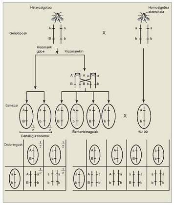 Aurreko sagu gurutzaketan, alelo gainartzaileak kromosoma batean baldin badaude, eta atzerakoiak alelo homologoan, badagogaldetzerik zergatik ateratzen diren F 2 an alelo gainartzaile eta atzerakoi baten arteko konbinazio berriak. Badirudi F 2 batzuetan elkarrekin lotutako lociek lortu dutela banatzea, eta independentzia osoz konbinatu direla gero berriz elkarrekin. Oso ondo ikusten da hori F 1 sagu batzuekin frogazko atzeragurutzaketa egiten denean. Ikus dezagun agertu ohi diren emaitzak:Horren ondorioz, praktikan ez dago erabateko loturarik, eta ager daitezke forma berri batzuk, gurasoenak ez bezalakoak, berkonbinagai deritzaienak. Horren zergatia, berriz ere, meiosian dago. I profasean, kromosoma homologoek pareak sortzen dituzte, kiasmak osatzen eta puskak, zein bere kromosomarekin, truka ditzakete eta, hala, trukegurutzaketa sortu. Era horretan, II anafasean alelo konbinazio berriak sortzen dira. Horren ondorioz, kromosoma baten loci bateko A aleloa, zelula zenbaiten meiosian zehar, B alelotik bana daiteke, kromosoma beraren beste loci batean baitago hori, eta kromosoma homologoan dagoen azken horren b aleloarekin elkartu.
