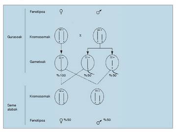 kromosoma teoria, sexua X eta Y sexu kromosomek eragiten dutela dioena. Aurrena, giza motak,