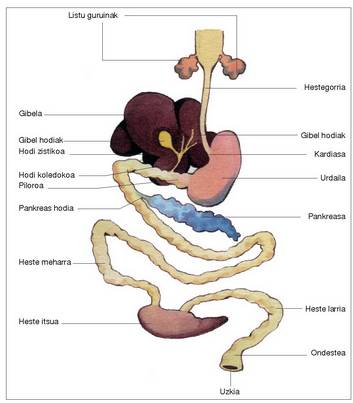 LABURPENA: Ornodun multzo desberdinek oso antzekoa izaten dute txegoste aparatuaren oinarrizko antolamendua, baina multzo bakoitzaren elikatze motaren ondorioz aldaketa batzuk sortzen dira antolamendu orokor horretan. Hortzak desberdinak izaten dira masailezurreko hezurretan duten kokagunearen eta bakoitzaren zeregin bereziaren arabera (ebakortzak, letaginak, etab.). Aipagarria da arrainen faringeak duen berezitasuna, handik eratzen baitira zakatzak. Hegaztiek berezitasun bat dute hestegorrian: paparoa. Urdaila da izaki mota batzuetatik besteetara gehien aldatzen den organoa; hegaztienean (bi ataletan banatua) eta hausnarkarienean (lau ataletan banatua) ditu bereizkuntza aipagarrienak. Hestean ere izaten dira egitura aipagarri batzuk, eta, hala, espiral itxurako balbula bitxi bat dute arrain kartilagodunek.