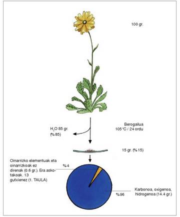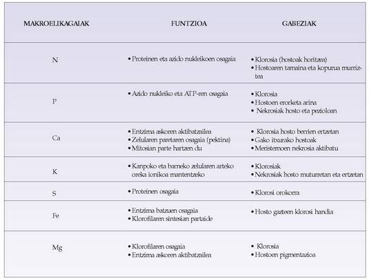 LABURPENA: Landareek elementu inorganikoetatik sintetizatzen dituzte beren molekula organiko propioak, energia iturri gisa eguzkiaren argia erabiliz. Horretarako, eta bizitzeko behar dituzten betekizunetarako, oinarri-oinarrizko 16 elementu hartu behar izaten dituzte eguratsetik eta lurretik. Landare baten osagai nagusia -%85 gutxi gorabehera- ura da; gainerakoa -%15- mineralak dira. Karbonoa, hidrogenoa eta oxigenoa dira mineral nagusiak, landarearen pisu lehorraren %96, alegia. Beste 13 elementuak bi multzotan daude banatuta; landarearen ehunetan zer kopurutan agertzen diren, hala izango dira makroelikagaiak (nitrogenoa, potasioa, kaltzioa, magnesioa, fosforoa eta sufrea) edo mikroelikagaiak (kloroa, burdina, boroa, manganesoa, zinka, kobrea, molibdenoa).