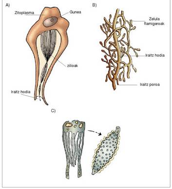 1. Irudia: Platelminto baten protonefridioak. A) Zelula flamigeroa. B) Zelula flamigeroen arteko lotura. C) Errotifero baten erraboila flamigeroaren luzetarako eta zeharretarako epaiak.<br><br>