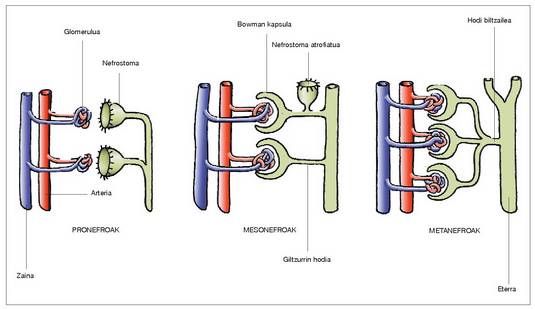Arrainen eta anfibioen mesonefrosak giltzurrin tubuluaren muturrak inguratzen duen glomeruluan Browmann kapsula bat du, eta irazketa zuzenean gertatzen da; nefrostoma atrofiatuta dago.
