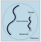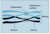 Leptotenoan kromosomak trinkotu egiten dira eta mikroskopioz ikusteko modukoak egiten dira. Ondoren, zigotenoan, bikote bakoitzeko bi kromosoma homologoak (bakoitza bere bi kromatidekin) mugitu egiten dira elkarren paralelo jarri arte; fenomeno horri sinapsi deitzen zaio eta lau kromatidek parte hartzen dutenez, tetrada izenaz ezagutzen da prozesu horretatik sortzen den egitura. Beraz, zelulak dituen adina kromosoma pare tetrada izango dira (23 giza espeziean).