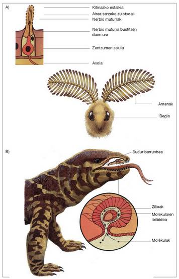 LABURPENA: Oso espezializazio desberdinak daude animalien artean inguruneko estimuluak jasotzerakoan. Ikusmena, entzumena, dastamena, usaimena eta ukimena, gizakiaren berezko zentzumenak izan arren, ez dira animalia guztietan aurkitzen, ezta gizakian duten indar berarekin ere. Bestalde, animalia mota batzuk gauza dira guretzat entzun ezinezkoak diren hotsak entzuteko, edota zenbait estimulu elektriko, magnetiko, izpi infragorri (beroa), edo uraren edo airearen mugimenduak jasotzeko. Nabarmentzekoa da, horien artean, zenbait animaliak oihartzunaren bidez orientatzeko eta harrapakinak aurkitzeko duten ahalmena.