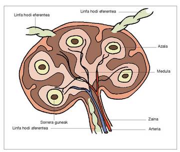 Organo horietan pilatzen dira zelula inmunologikoak; linfa gurintxoetan eta barean gertatzen dira makrofagoen eta neutrofiloen fagozitatze lana eta erreakzio inmunologikoa, mikrobioak, zatiki arrotzak, ehun hondakinak eta zelula hilak suntsitzen dituena.