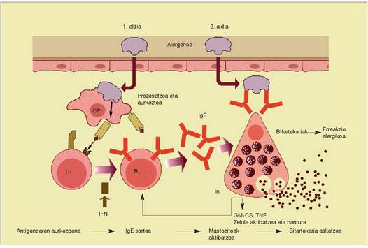 Alergenoa organismora lehen aldiz sartzean hasten da. Zelula antigeno-aurkezleek (makrofagoek eta beste batzuek) irensten eta prozesatzen dute alergenoa, eta T linfozi- H toei aurkezten diote. Linfozito horiek bitarteko kimikoak askatzen dituzte (interleuzina4 eta beste batzuk), eta B linfozitoen klon bat aktibatzen dute. Horren ondorioz, E inmunoglobinak isurtzen dituzten plasma zelula bihurtzen dira B linfozitoak. Inmunoglobulina horiek (antigorputzak) alergenoekin (antigenoekin) bat egiteaz gainera, mastozito hartzaileekin ere batzen dira.