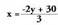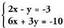 Aurretik azaldu bezala eginez gero, berdintza hau lortzen da : 6x + 9 = 6x + 10. Terminoak aldez aldatzean ezinezko emaitza lortzen da, izan erebaita.Emaitza horrek sistema bateraezina dela adierazten du, ez baitu emaitzarik.2x bi ekuazioetan bakantzen bada :Bi adierazpenak berdintzean :Azken ekuazio hori ebaztean y = 4 lortzen da. Balio hori bigarren ekuazioan ordezkatuz gero, x-aren balioa lortzen da :alegia. Beraz, sistemaren emaitza