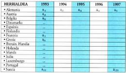 Emaitzak 15 lerro eta 5 zutabeko koadro batean idatz daitezke, ondoren ikus daitekeenez :Koadro honetan, herrialde bakoitzari lerro bat dagokio eta lerro horretan islatzen da azken bost urteotan kontratazioek izan duten bilakaera. Zutabean, aldiz, urte horretan herrialde bakoitzak duen egoera ikus daiteke.Oro har, letra batez eta bi azpindizez adieraz daiteke koadroko laukitxo bakoitza. Lehen azpindizeak lerroa adierazten du, eta bigarrenak zutabea.Horrelaelementu generikoa da, zeinetan i egungo Europar Batasuneko 1tamabost herrialdeak ezaugarritzen dituen lerro azpindizea den, eta j, aztertutako urtearen berri ematen duen zutabe azpindizea. Gure adibidean, zenbaki taulako elementu kopurua, labur idatzita