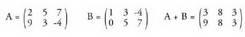 Dimentsio berdinetako bi matrizeren batura, bi matrizetako indize berbera duten elementuak ordenan batuz lortzen den dimentsio berdineko beste matrize bat da.Bitezetabatu nahi diren matrizeak. S matrize baturak sy du elementu generikotzat, eta honela lortzen da :A eta B matrizeen batura horrela adierazten da : A + B• Adibideak :Matrizeen baturak ondorengo legeak betetzen ditu :