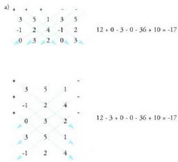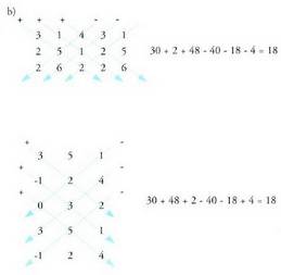 Hirugarren mailako determinantea lortzeko Sarrusen erregelara jo ohi da. Determinantearen eskuinetan lehen bi zutabeak idazteari deitzen zaio horrela.Zeinu positiboko biderkadurak diagonal nagusiko elementuei eta diagonal nagusiaren paraleloetakoei dagozkie.Zeinu negatiboko biderkadurak, aldiz, bigarren diagonaleko elementuei eta haren paraleloetakoei dagozkie.Emaitza berbera lortzen da lehen bi zutabeak eskuinetan idatzi ordez, lehen bi lerroak hasierako determinantearen azpian idatzita.Azaldutakoa hobeto uler dadin bi moduetara erabiltzen da Sarrusen erregela ondorengo adibideetan.Ariketa ebatziak.1. Kalkulatu ondorengo determinanteak :Ebazpenak: