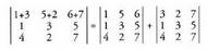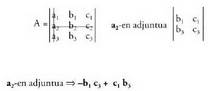 Har bedi ondorengo determinanteaIkusi berri den bezala, horrela garatzen da :.eta- ri ateratzen bazaizkie biderkagai komunak honela idatz daiteke :Emaitzan ageri denez lehen lerroko elementu bakoitza adjuntu izeneko batek biderkatzen du. Horrela,- en adjuntuada, hain zuzen ere, A-tikduten lerroa eta zutabea ezabatuta lortzen den determinanteaEra berean- en adjuntua, A-tik elementu hori duten lerroa eta zutabea ezabatuta lortzen da, baina aurkako zeinuarekin, toki bikoitiko lerroan aurkitzen delako..dagoen lerroa eta zutabea ezabatzen badira, ondorengoa lortzen da :eta beraz,-en adjuntuaElementu baten adjuntua, hasierako matrizetik kontuan hartzen den elementua duten lerroa eta zutabea ezabatzean lortzen den matrizearen determinantea da. Zeinu berdina edo aurkakoa izango du, elementuak hartzen duen tokia (erro bakoitian edo bikoitian dagoen arabera.Ariketa ebatziak.Garatu ondoko determinanteak lerro bateko elementuetatik abiatuta.