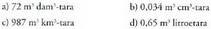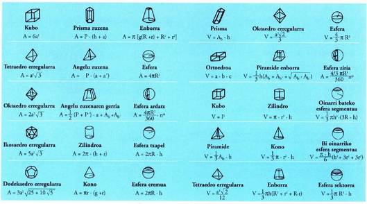 14. Aletegi batek zilindro forma du, 3 m-ko diametroarekin eta 3 m-ko alturarekin. Kono formako teilatu batek ixten du, eta kono horrek 1,5 m du altura. Zein bolumen eduki dezake gehienera? Zein da albo gainaldea?15. Zilindro formako tunel bat eraiki da, 3 m-ko erradioa eta 150 m-ko luzera duena. Zein da harrotu den lur bolumena?16. 3 eta 4 banakoko katetuak dituen triangelu zuzen bat 4 banakoko katetu baten inguruan biratzen da. Kalkula ezazu biraketa horrek sortzen duen konoaren bolumena.17. Zein da esferaren bolumenaren eta esfera horretan zirkunskribatua dagoen zilindroaren bolumenaren arteko arrazoia?