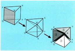 zuzen bat hiru piramide berdinetan zatika daiteke.Izan ere, QRS oinarria eta NS altura duen prisma bat, bi poliedrotan
