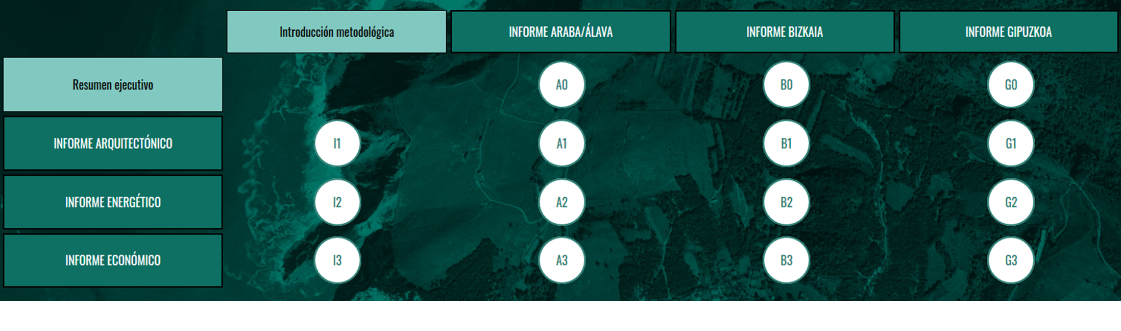 Enfoque territorial, dirigido al equipo político: esta aproximación permite acceder directamente a la síntesis de los indicadores e índices clave de diagnóstico del parque residencial para cada uno de los ámbitos territoriales de estudio. Se estructura en 3 informes correspondientes a Araba/Álava, Bizkaia y Gipuzkoa.