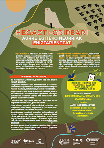 Gure lurraldean hegazti basatiengan hegazti-gripearen kasu kopuruak gora egin duenez, Eusko Jaurlaritzak, hiru Foru Aldundiekin, NEIKERekin eta ELIKArekin batera, informazio-kartel bat egin du ehiztarientzat, gaixotasun hori prebenitzeko neurriei buruz ohartarazteko.