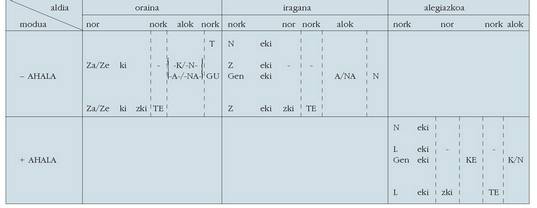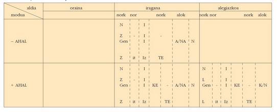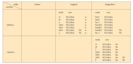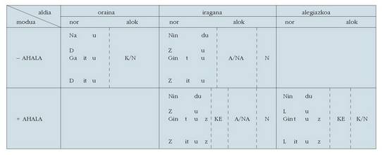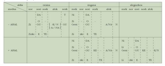 ohar egitea:1. Koadro hauetan ez dira biltzen Euskaltzaindiak onartutako adizki
