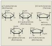 Espazioan duten kokaleku hori dela eta, karbono asimetriko batzuk besteak baino "ageriago" daude (nabarmenagoak dira); motaz-motahauek dira karbono asimetriko “ageriagoak”: piranosetan, karbono anomerikoa eta molekularen beste aldean aurrez aurre daukan molekula; furanosetan, karbono anomerikoa da nabarmenena. Kokalekua dela eta, karbono horiei zor diete monosakaridoek bi eratara erreakzionatzeko gaitasuna, agente oxidatzaileen eta agente erreduzitzaileen aurrean.8. Irudia: “Aulki” eta “ontzi” eraketak piranosa motako eraztunetan. “Kartazal” eraketa furanosa motako eraztunetan.<br>Planoaren gainean dauden multzoak marra jarraituaz daude markatuta, planotik behera daudenak, berriz, marra etenaz.<br>Aipatzekoa da 1 eta 4 karbonoek piranosetan duten kokaleku nabarmena, eta karbono anomerikoak (1. pentosetan eta 2. hexosetan) furanosetan dutena.<br>Orain arte aztertu diren molekuletan ikusi den bezala, hainbeste aldaera izan daitezke, non izen arrunta erabiliz gero, oso zaila baita jakitea zer gai elkartu ari garen hain zuzen aipatzen, eta, beraz, nomenklatura jakin bat erabiltzen da horiek izendatzeko.